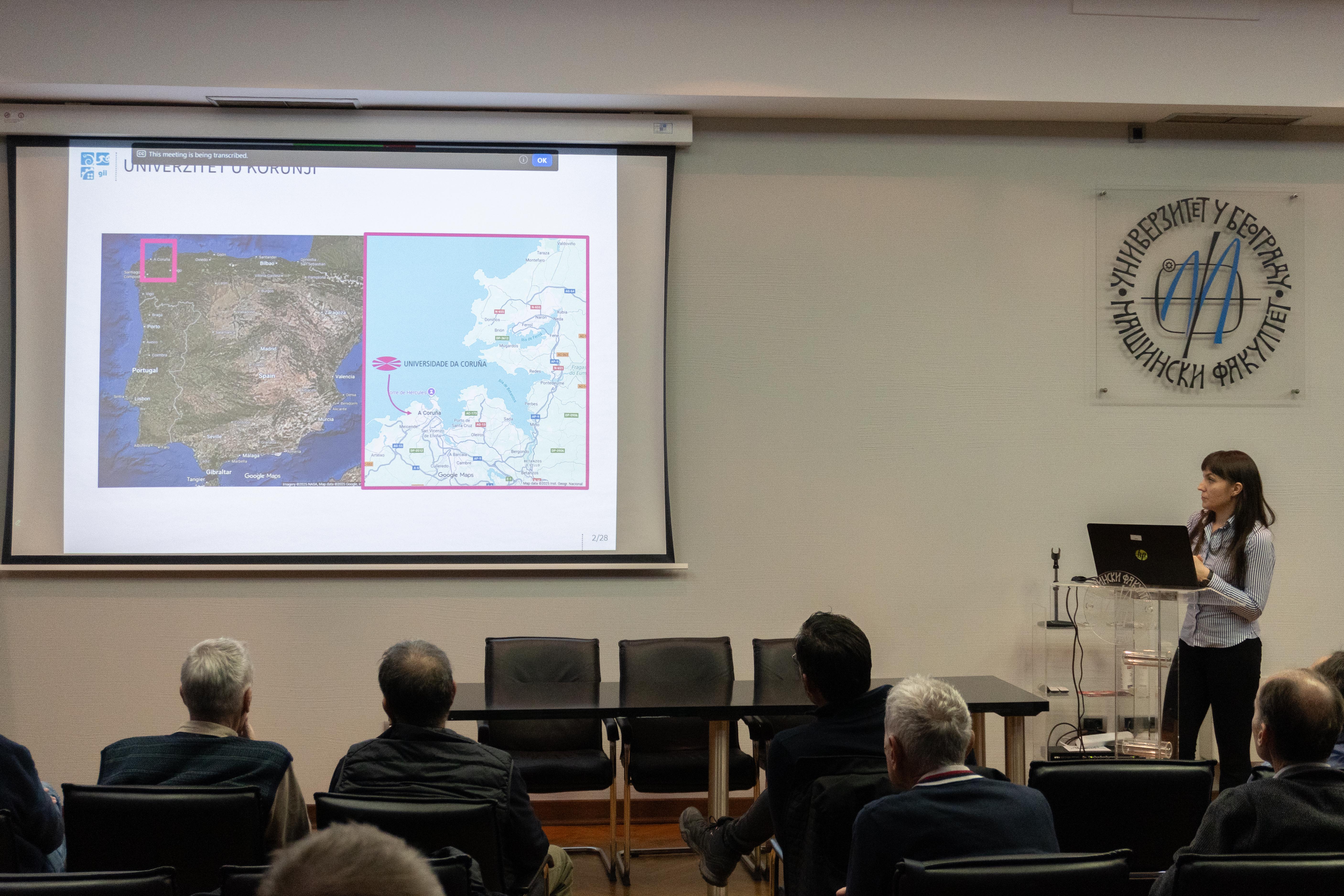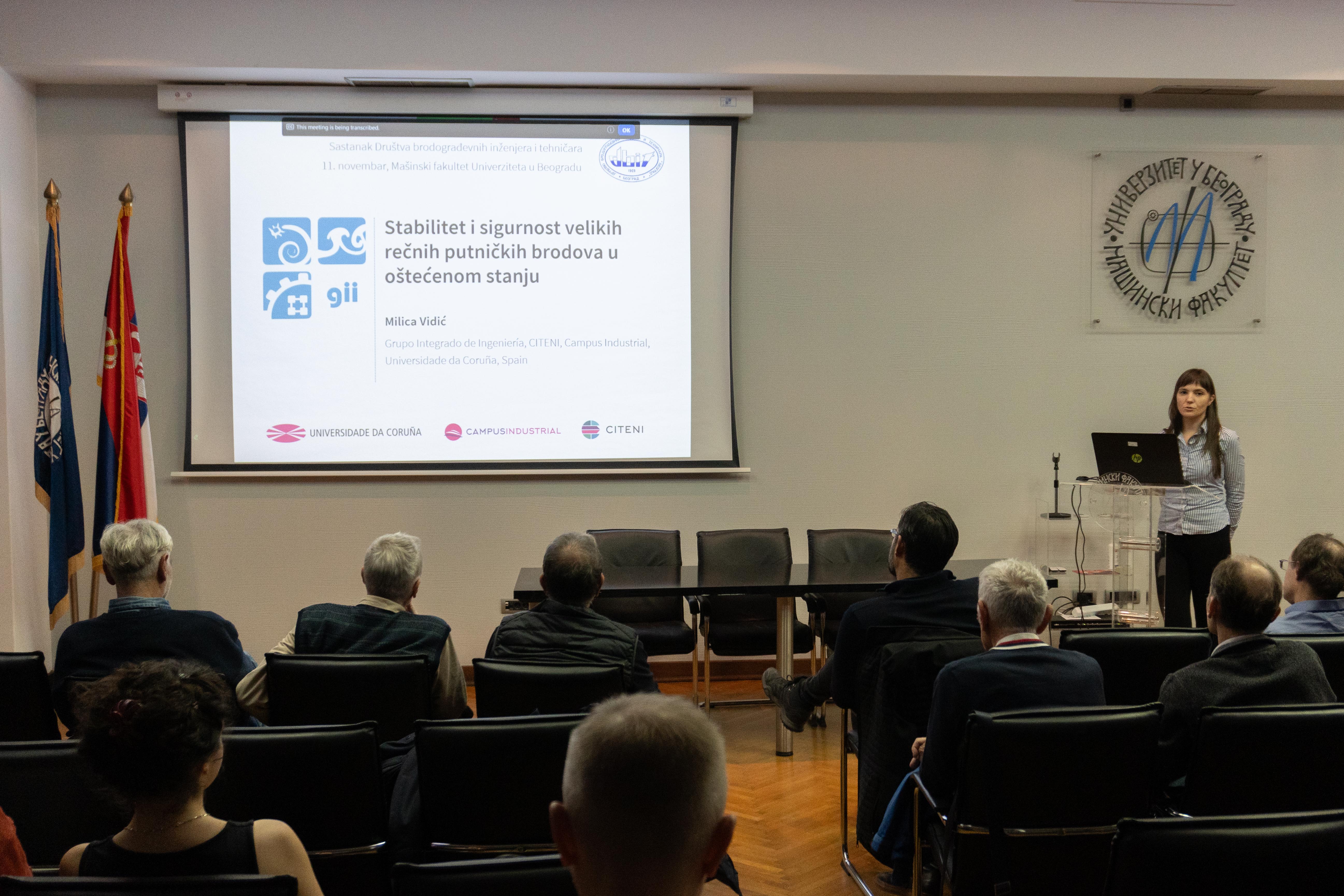 Predavač je bila Milica Vidić istraživačica i studentkinja doktorskih studija na Univerzitet u Korunji. Milica Vidić je osnovne i master akademske studije završila na Katedri za brodogradnju, Mašinskog fakulteta u Beogradu, a nakon studija je bila zaposlena kao istraživačica-saradnica na Katedri za brodogradnju, gde je, između ostalog, bila angažovana na predmetima vezanim za stabilitet i sigurnost broda. Publici je u okviru predavanja predstavila organizaciju i istraživačke kapacitete Univerziteta u Korunji, kratak pregled skorašnjih istraživačkih projekata, a glavni deo predavanja su bili najnoviji rezultate istraživanja u oblasti stabiliteta u oštećenom stanju rečnih kruzera, koja je obavila u okviru svoje doktorske disertacije.