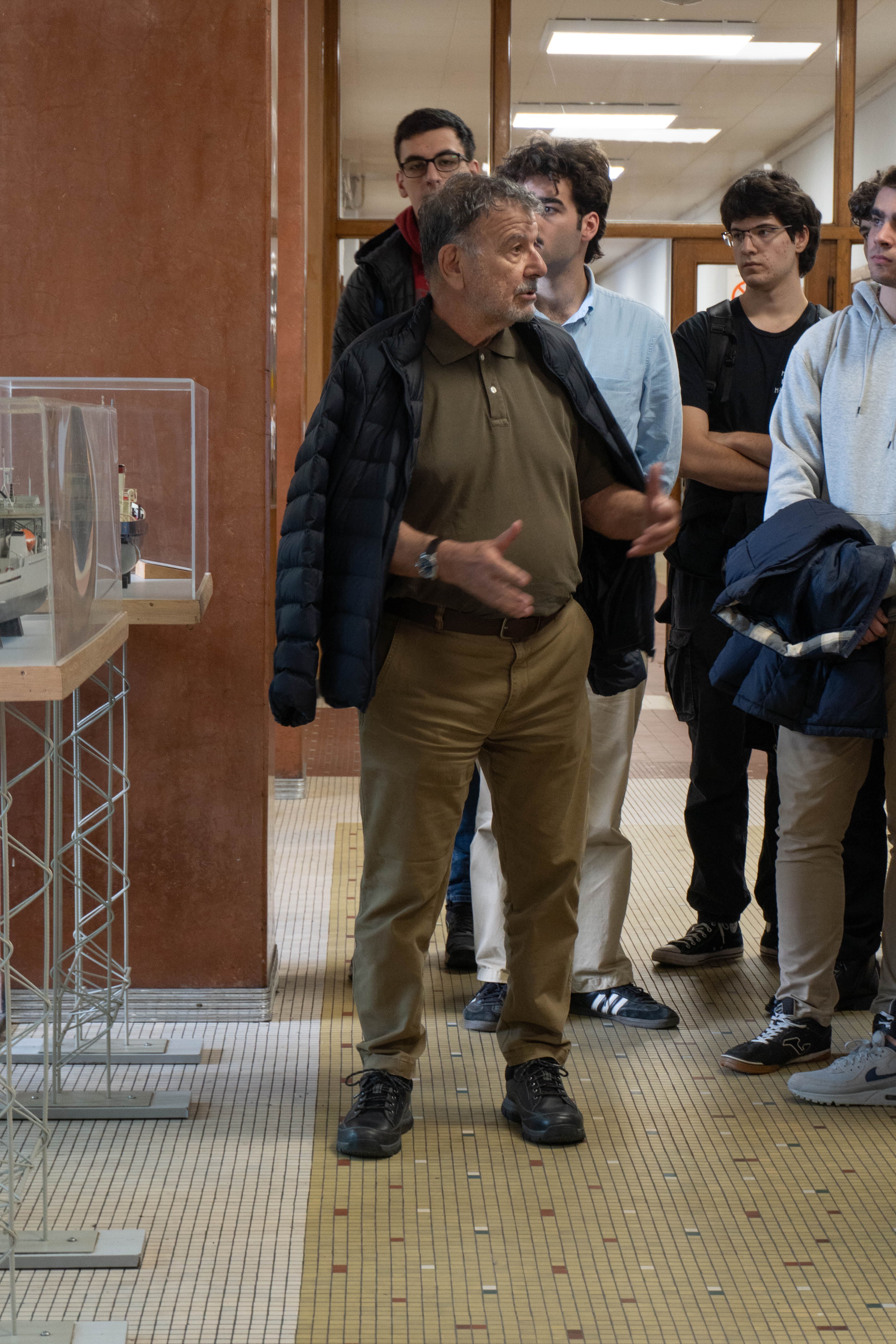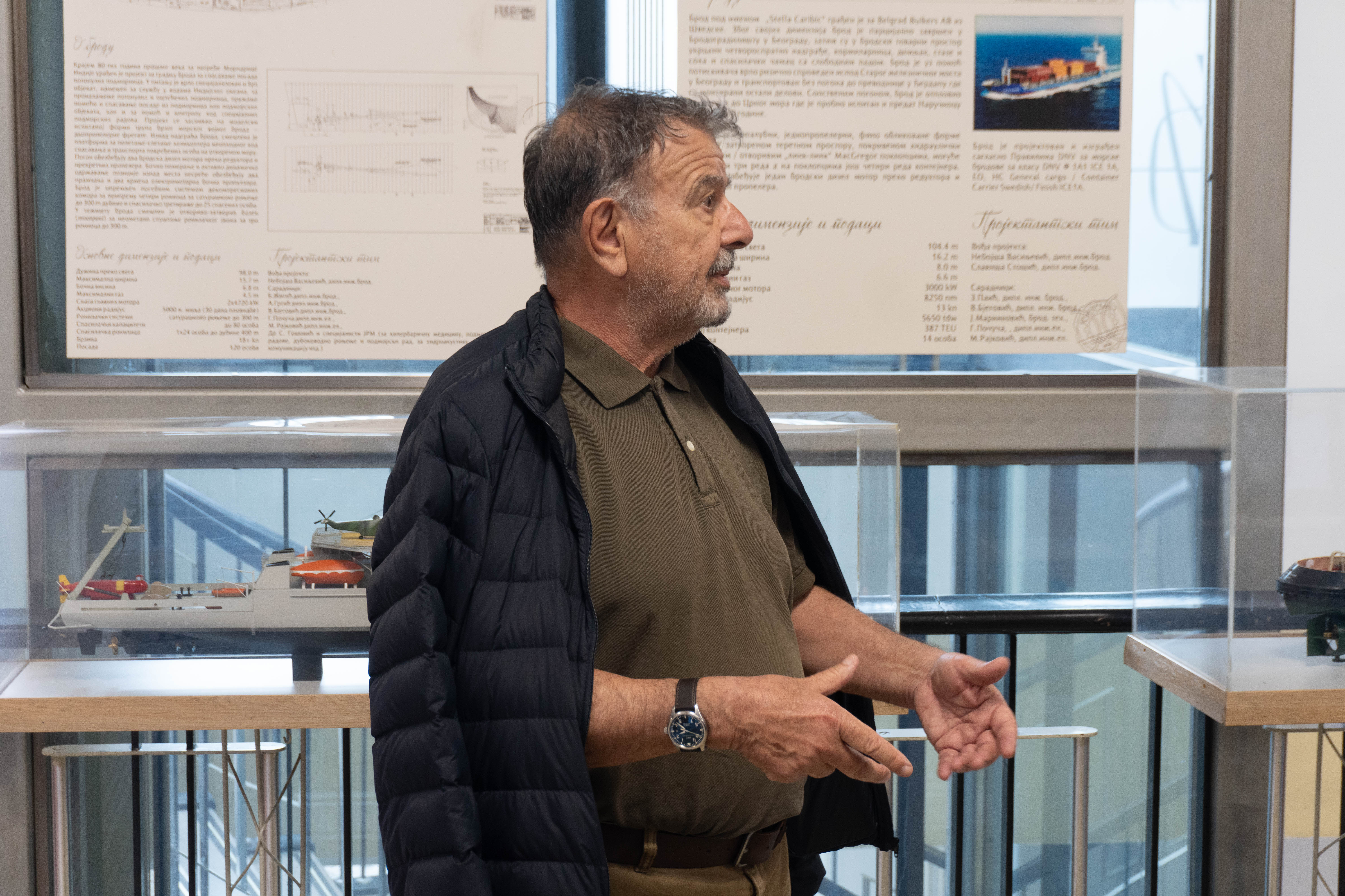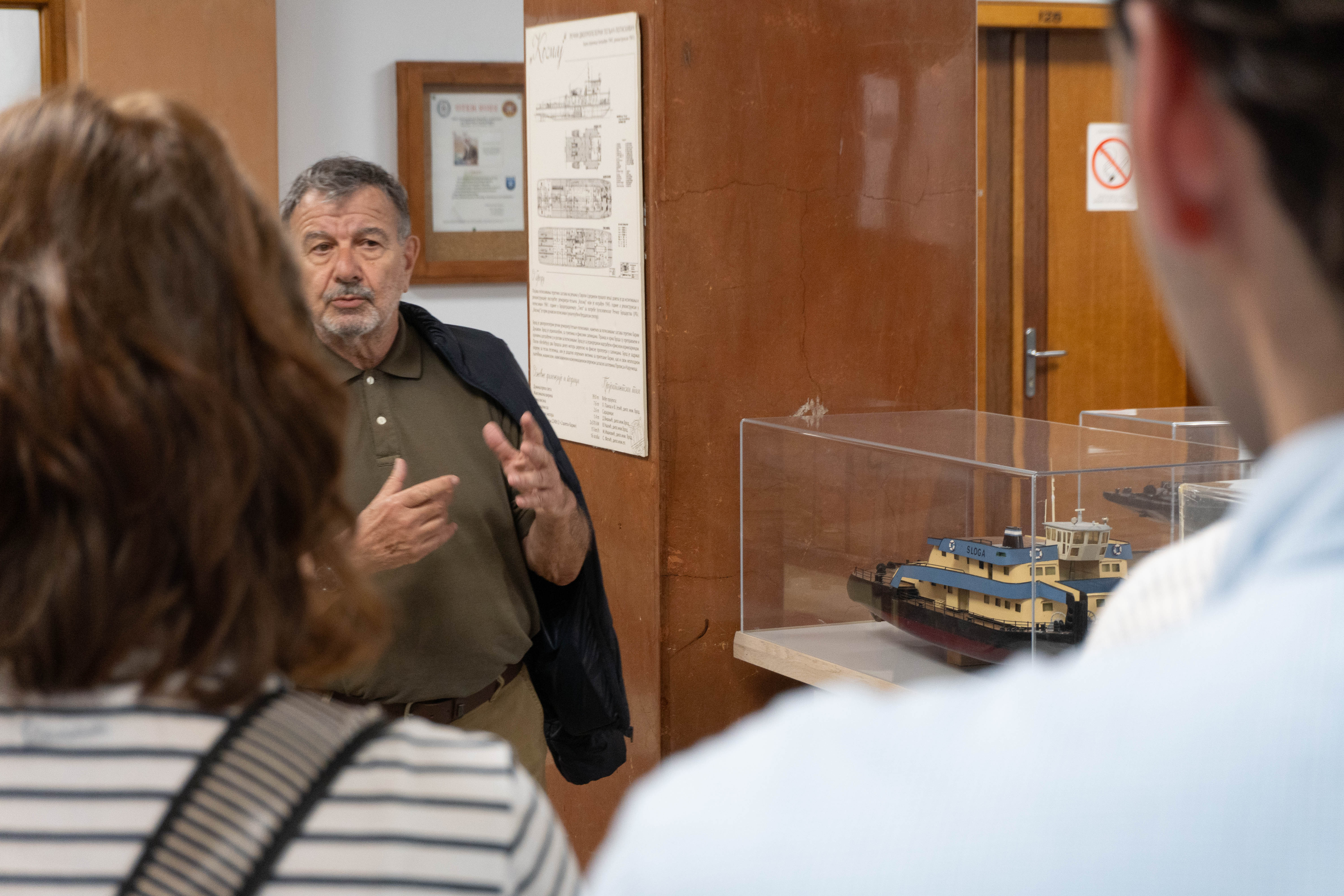 Vođenje kroz kolekciju predvodio je redovni profesor u penziji dr Dejan Radojčić, čiju kratku biografiju (za one koji ga možda ne poznaju) možete pročitati ovde. Zahvaljujući radnom iskustvu u brodogradilištu Beograd pre zaposlenja na Mašinskom fakultetu, prof. Radojčić je bio idealan predavač za ovu temu. U ograničenom vremenu koje je imao na raspolaganju, ponudio je uvid u specifičnosti plovnih objekata i zanimljive projektne zahteve, a posebnu pažnju posvetio je tehnologiji rečnih brodova – tegljačima, guračkim sastavima i samohodnim brodovima. Priča nije mogla da protekne bez osvrta na ulogu generacije profesora pre njega, čiji je uticaj duboko utkan u istoriju brodogradilišta Beograd, ali i Katedre za brodogradnju – prof. Ribar, prof. Zrnić, prof. Bilen i prof. Jovanović.